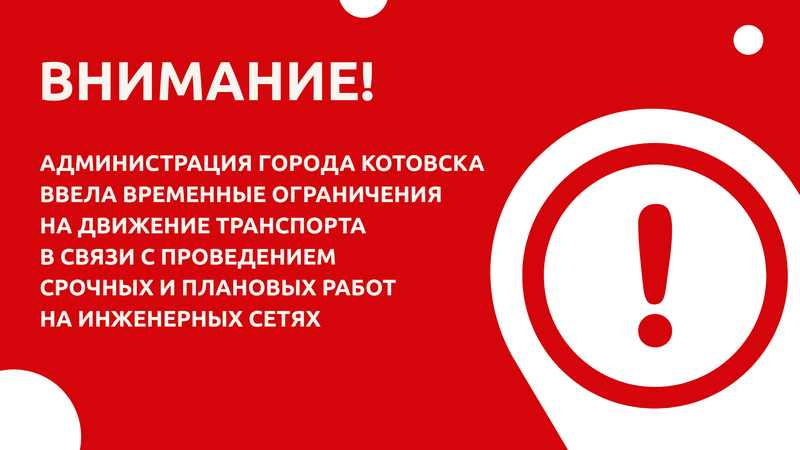 С 9 часов утра 6 ноября до 18 часов вечера 19 ноября будет полностью прекращено движение транспортных средств на участке улицы Кирова — от дома № 27 до дома № 31. Причина — аварийно-восстановительные работы на сетях теплоснабжения, которые выполняет муниципальное предприятие «КотовскТеплоСервис».