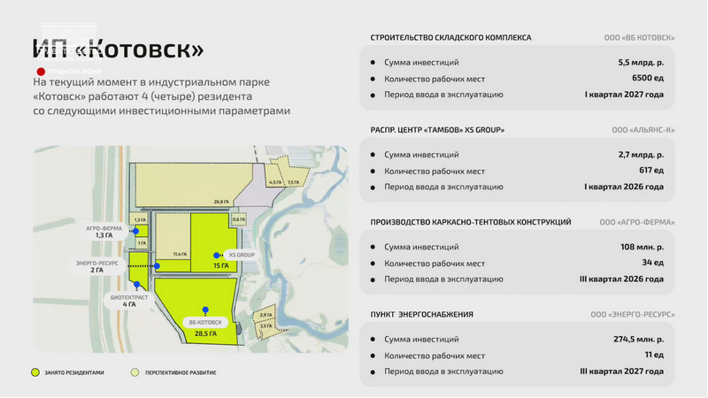 По словам Максима Сеструхина, индустриальный парк в Котовске, созданный в рамках статуса моногорода и подкреплённый преференциальным режимом территории опережающего развития, уже демонстрирует значительные результаты. На сегодняшний день здесь функционирует складской комплекс компании «Вайлдберриз», обеспечивший 6 500 рабочих мест, которые уже заняты жителями региона. Также запущен распределительный центр X5 Group — на данный момент там трудятся более 100 человек, при плане в 617 рабочих мест.