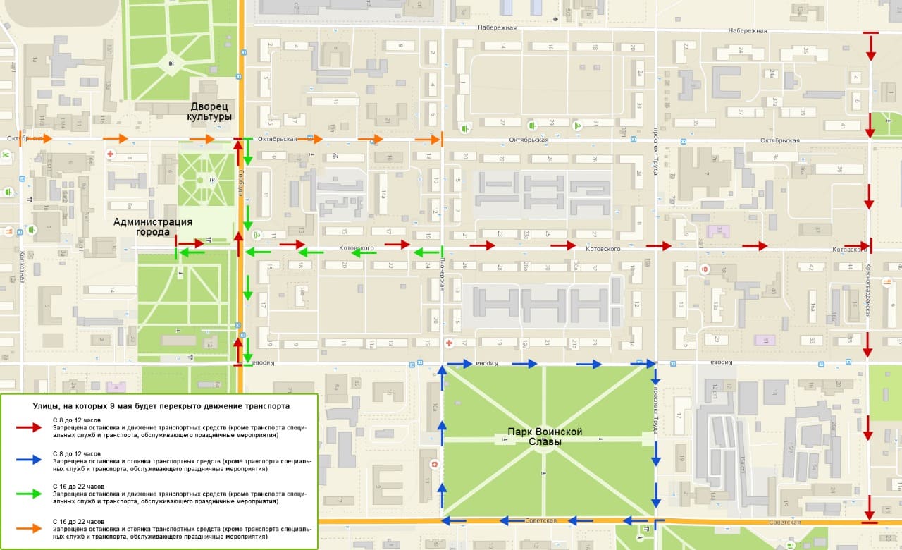 С 8 до 12 часов запрещена остановка и движение транспортных средств (кроме транспорта специальных служб и транспорта, обслуживающего праздничные мероприятия) по улице Свободы - от улицы Кирова до улицы Октябрьской; по улице Котовского - от улицы Свободы д.8 (здание администрации города) до улицы Красногвардейской; по проспекту Труда - от улицы Набережной до улицы Советской.
