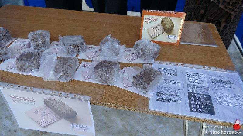 В память о тех страшных событиях и подвиге советского народа волонтеры Победы при поддержке администрации Котовска раздали горожанам 100 кусочков хлеба, изготовленного на предприятии «Котовскхлеб» по рецепту военного времени. Вместе со 125-граммовыми кусочками каждый получил карточку с фактами о том, с какими потерями столкнулись жители осажденного города во время блокады.