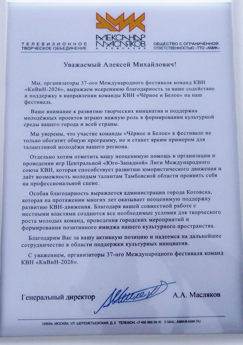 Участники котовской команды КВН «Черное и белое», недавно вернувшиеся с 37-го международного Сочинского фестиваля, встретились с главой города Алексеем Плахотниковым, чтобы рассказать о своём выступлении и планах на новый сезон. Встреча прошла в тёплой, дружеской атмосфере, где смешались эмоции от недавней сцены и надежды на будущее. Особый момент встречи — команда передала Алексею Плахотникову благодарственное письмо от генерального директора творческого объединения «АМиК» Александра Маслякова за личное содействие и поддержку в организации участия команды «Черное и белое» на фестивале «КиВиН-2026».